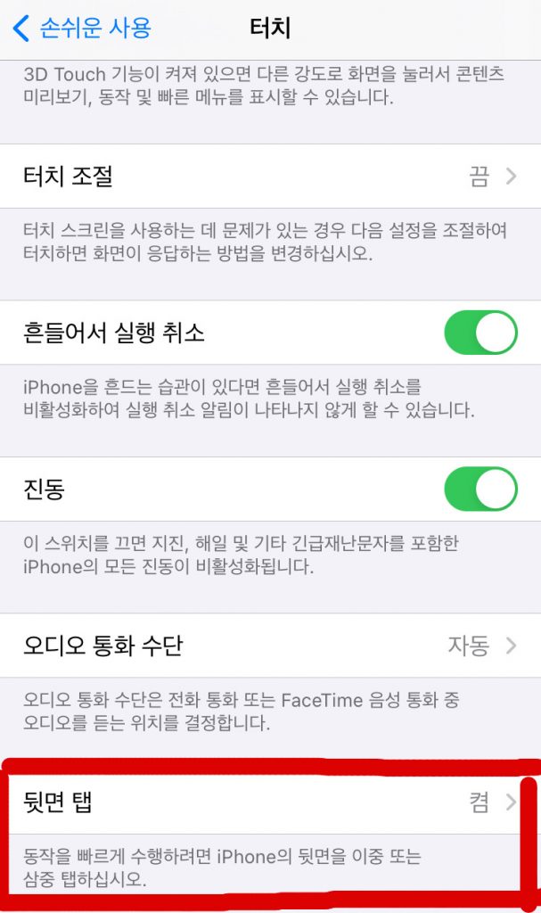 손쉬운 사용에서 터치 메뉴로 들어가 스크롤을 아래로 내리면 최하단에 ‘뒷면 탭’ 항목이 있다.