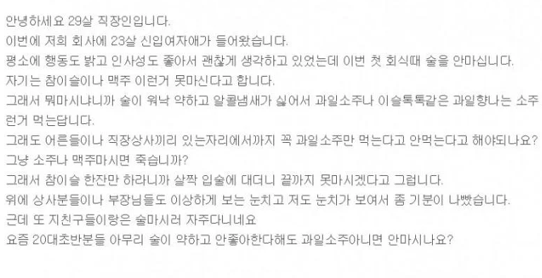 최근 한 온라인 커뮤니티에서는 “과일 소주 아니면 안 마시는 신입사원”이라는 글이 올라왔다.