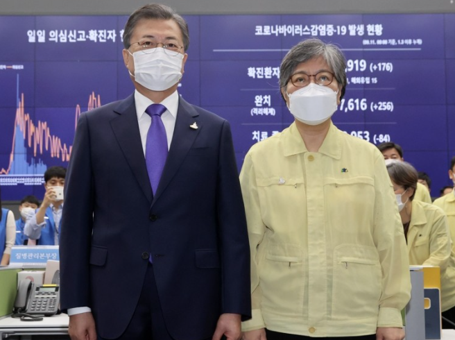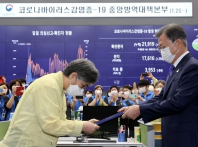 앞서 문재인 대통령은 지난 11일 충북 청주에 위치한 질병관리본부 긴급상황센터를 찾아 정은경 신임 질병관리청장에게 임명장을 수여했다.