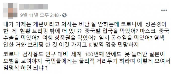 A 전문의는 “가재는 게편이라고 의사는 비난을 잘 안하지만, 정은경이 한 게 현황 브리핑밖에 더 있냐”며 글을 적어내렸다.