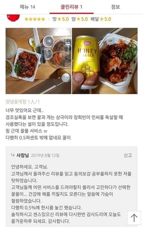 이어 “그런데 꿀물이 서비스ㅠ 다행히 0.5퍼센트 밖에 없네요 꿀이”라고 설명했다.