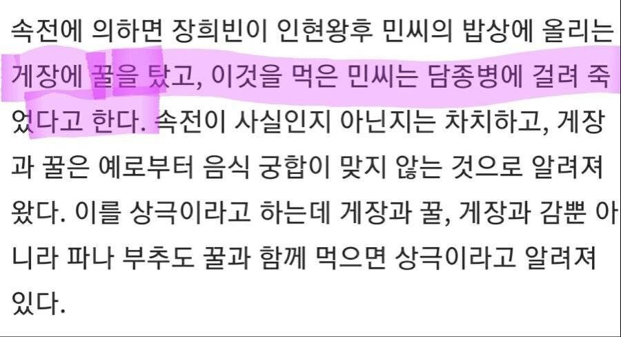 실제로 장희빈은 인현왕후 민씨의 밥상에 올리는 게장에 꿀을 탔고, 이것을 먹은 민씨는 담종병에 걸려 죽었다고 한다.