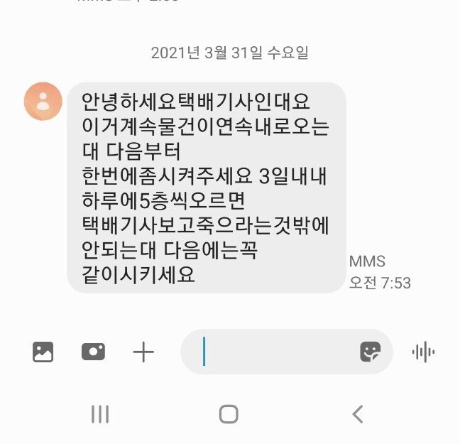 택배기사는 “이거 계속 물건이 연속 내로 오는데 다음부터 한번에 좀 시켜달라. 3일내내 하루에 5층씩 오르면 죽으라는 것밖에 안된다”며 공격적인 문자를 보냈다.
