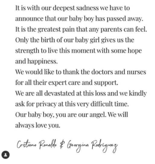 호날두는 아들의 사망에 대해 “부모라면 느낄 수 있는 가장 큰 고통”이라며 “딸 아이의 출생만이 희망과 행복을 가지고 이 순간을 살아갈 힘을 준다”고 말했다.