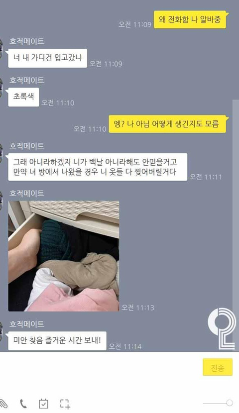 언니는 “그래 아니라하겠지. 니가 백날 아니라해도 안 믿을 거고 만약 너 방에서 나왔을 경우 니 옷들 다 찢어버릴 거다”라고 선언했다.