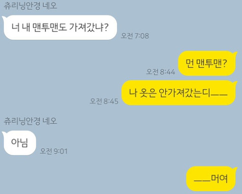 누리꾼들은 “진짜 왜그러는 거야ㅋㅋㅋ 근데 나도 동생한테 그럼”, “우리도 서로 맨날 그러는데”, “맞아 언니 맨날 전화해서 옷 어딨냐고 물어봐놓고 갑자기 찾았대” 등의 반응을 보이고 있다.