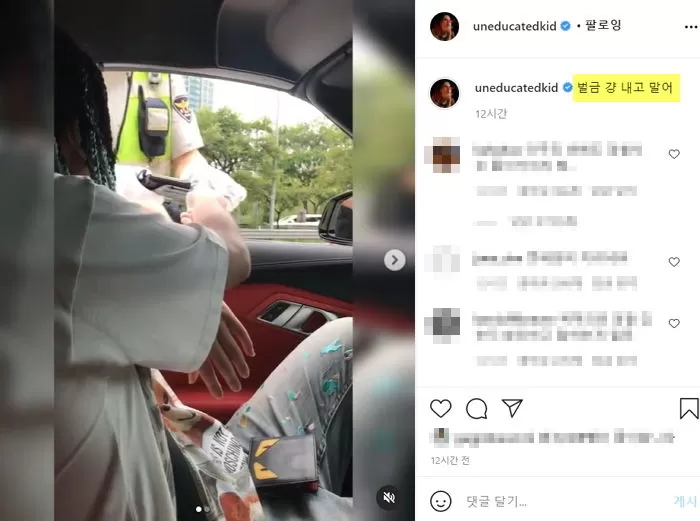지난 13일 언에듀케이티드 키드는 자신의 인스타그램에 “벌금 그냥 내고 말어”라는 글과 짧은 영상을 게재했다.