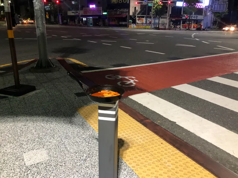 사진 속에는 횡단보도에 뜬금없이 프라이팬에 담긴 떡볶이가 놓여있는 것을 확인할 수 있다.