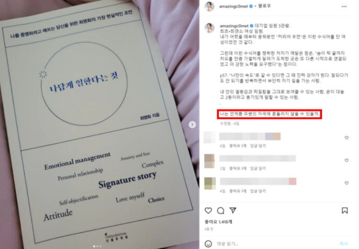 이혜성은 인스타그램을 통해 ‘나 답게 일한다는 것’ 책 글귀를 인용하며, “나는 언제쯤 주변의 자극에 흔들리지 않을 수 있을까”라 글을 작성해 게시했다.