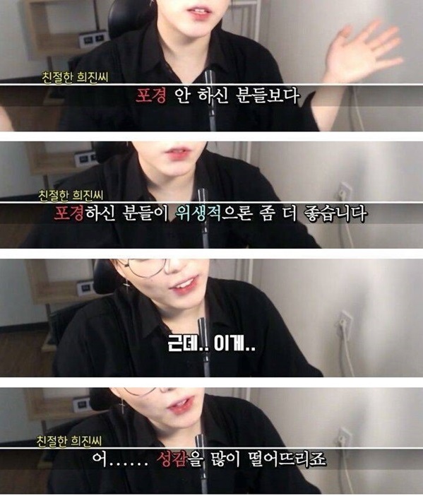 이는 인터넷 방송 ‘팝콘티비’에서 활동중인 BJ 친절한 희진씨의 방송 중 일부였는데, 그는 ‘포경수술의 오해와 진실’이라는 주제로 방송을 진행했다.