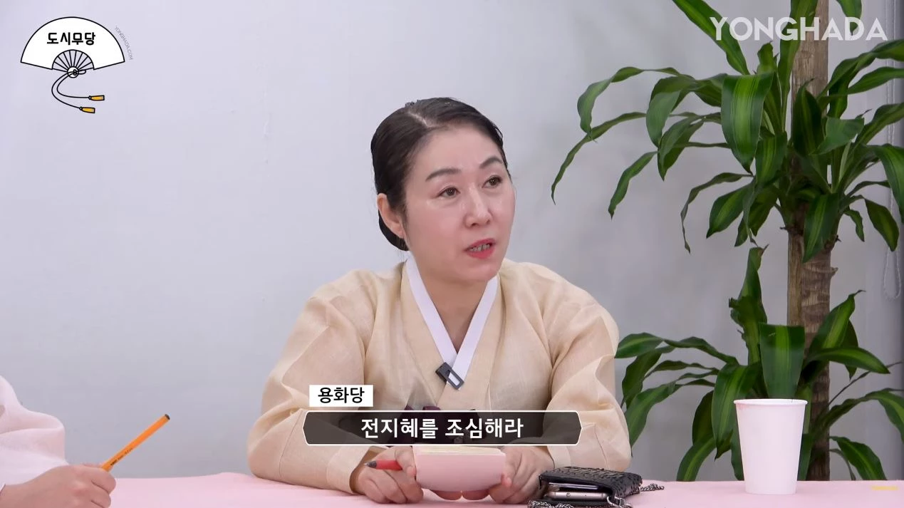 용화당은 “전지혜를 조심해라. 여자가 보통 사람이 아니에요. 잘못 만난 건 아닌데 철구 씨가 감당하기가 좀 힘든 여자를 만났죠. 머리가 너무 좋고 사주가 너무 높아요. 그리고 신기가 너무 많으니까 이게 어디로 튈지 모르는 거야. 마음이 어디로 튈지. 다음 날 어떻게 변할지 이걸 예측하기가 어려운 분이거든요. 전지혜 씨가 내 위에 남자가 없는 사주인데 이렇게 남편을 일찍 만나셨으니 고비가 있을 거라고 생각합니다”라고 말했다.