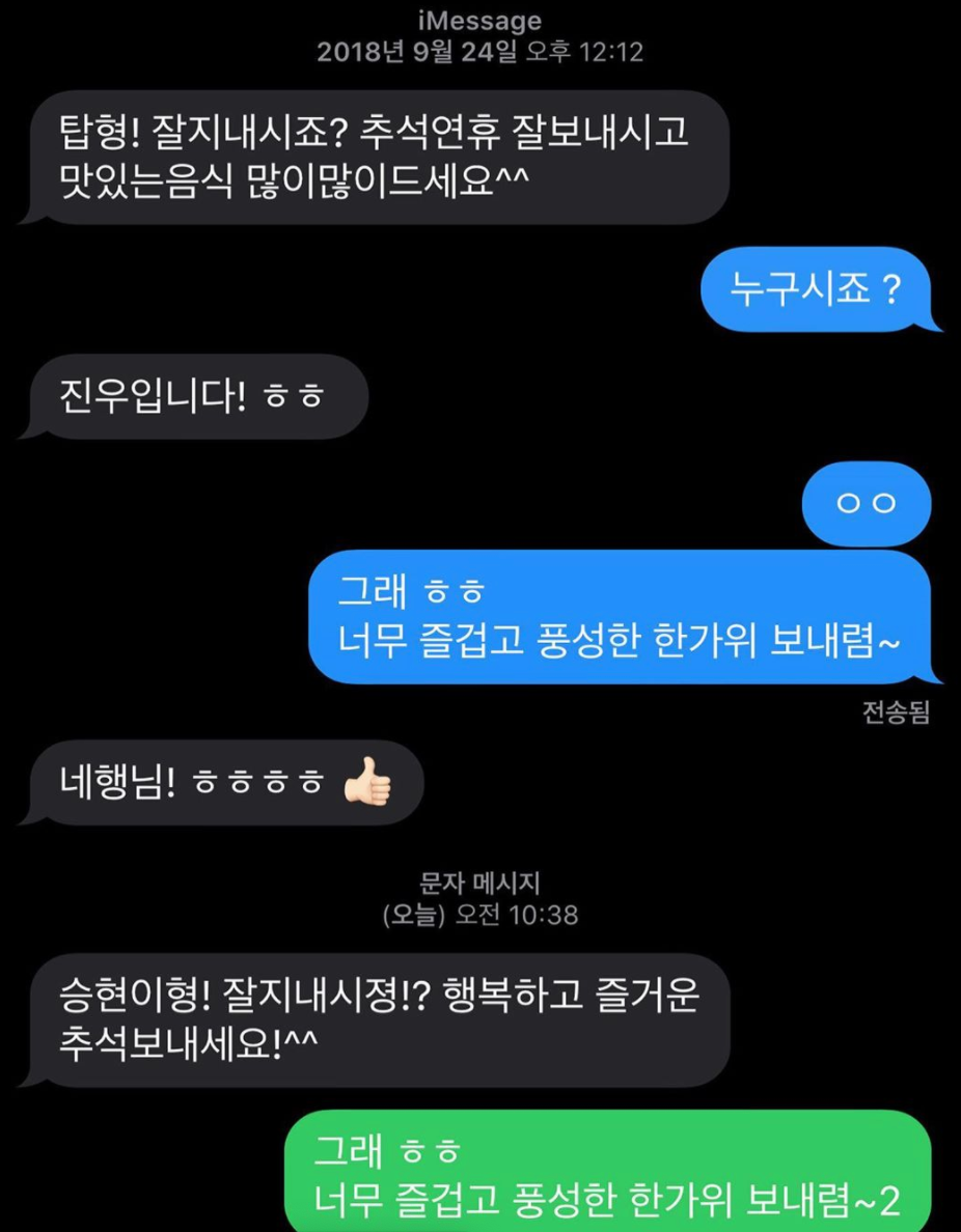 김진우는 “탑형! 잘 지내시죠? 추석 연휴 잘보내시고 맛있는 음식 많이많이 드세요^^”라고 연락했다.