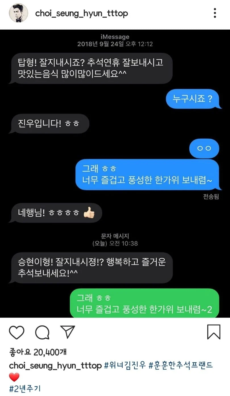 30일 탑은 보이그룹 ‘위너’의 김진우와 주고받은 추석 메세지를 공개했다.