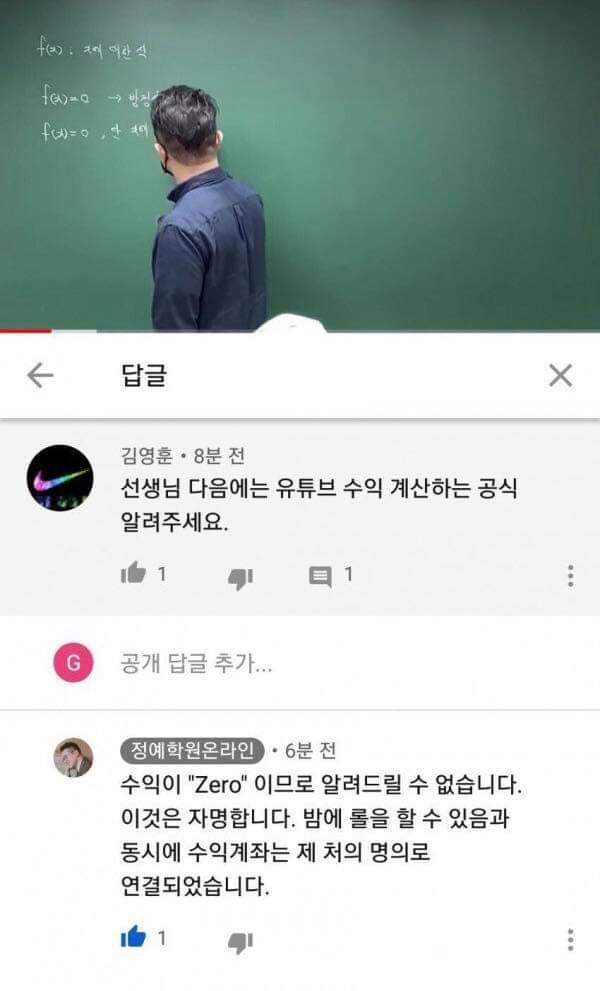한 구독자는 댓글을 통해 “선생님 다음엔 유튜브 수익 계산하는 공식 알려주세요”라고 물었다.