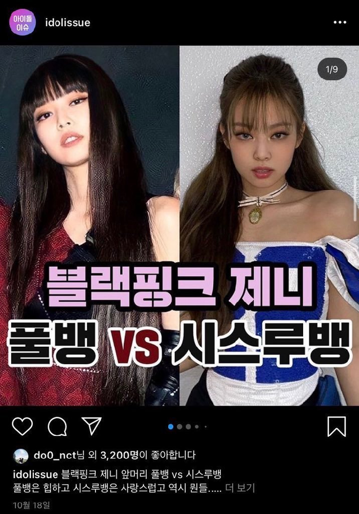 지난 18일 인스타그램 ‘idolissue’ 계정에는 제니 관련 게시물이 올라왔다. 인스타그램 사용자는 “블랙핑크 제니 앞머리 풀뱅VS 시스루뱅”이라는 글과 함께 제니의 사진을 올렸다.