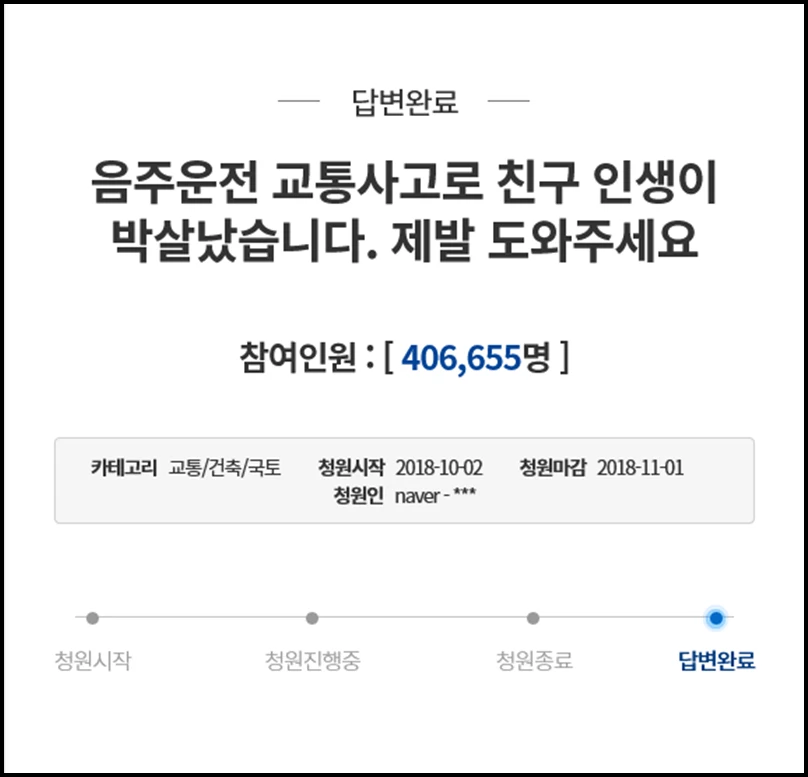 문 대통령은 “음주운전은 이제 실수가 아닌 엄중한 범죄”라며 처벌을 강화하겠다고 밝힌 바 있으나, 문 대통령의 퇴임이 50여 일밖에 남지 않아 게시판 운영을 더 이어나가기 어려운 상황이다.