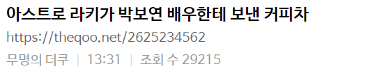 작성자 A씨는 “아스트로 라키가 박보연 배우한테 보낸 커피차” 라는 제목의 글로 많은 누리꾼들의 궁금증을 유발시켰다.