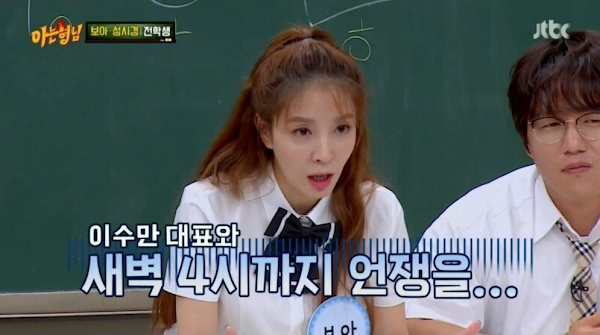보아가 이수만과의 논쟁 에피소드와 출연 목표를 공개했는데 보아는 아는 형님 출연을 두고 이수만과의 논쟁이 있었음을 밝히면서 그는 “이번에 아는 형님 나가겠다고 하니까 이수만 선생님이 ‘저번에 출연한 거 재미없었다’고 말하셨어”라고 했다.