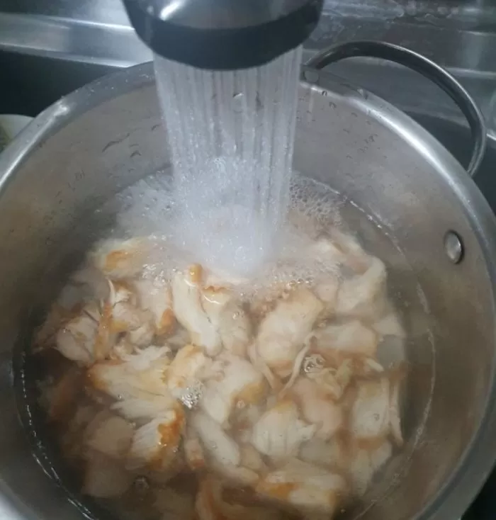 먼저 튀김옷을 일일이 분리한 다음에 냄비에 푹 끓였다.