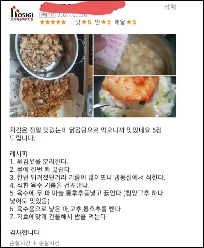 A씨는 “치킨은 정말 맛 없는데 닭곰탕으로 먹으니까 맛있네요”라며 별점 5점을 선물했다.