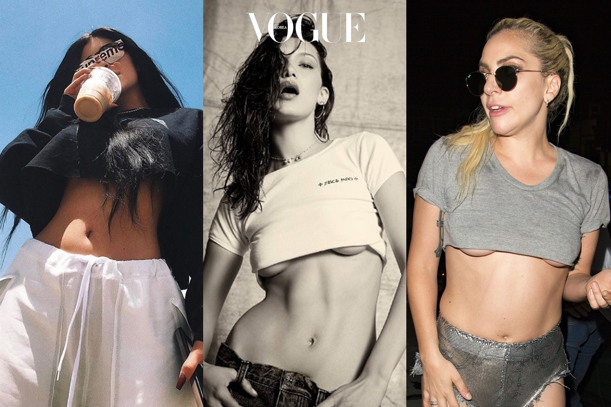 최근에 할리우드 스타들 사이에서 유행하는 이 ‘언더붑’패션은 살짝 아래 가슴이 보이게 입는 것이 포인트 이다.