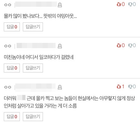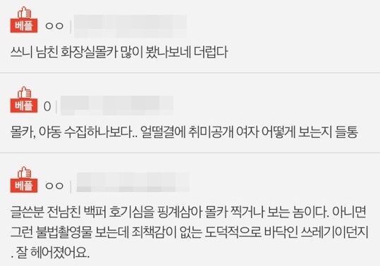 이런 A씨의 말에 남친은 야. 내가 몇 달 참아줬는데 너 그거 가지고 그러냐. 그래 그건 그렇다 치자. 근데 공중화장실은 이해할 수가 없다. 몰카? 어차피 얼굴 안 나오고 니 똥X랑 거기만 나오는데…”라는 망언을 했다.