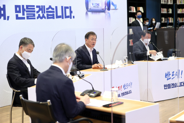 문 대통령은 “코로나 치료제와 백신만큼은 설령 다른 나라가 먼저 개발에 성공하고 우리가 수입할 수 있게 된다 하더라도 끝까지 자체 개발을 성공시켜야 한다는 의지를 가지고 있다”며 “정부는 끝까지 확실히 성공할 때까지 지원을 아끼지 않겠다”고 말했다.