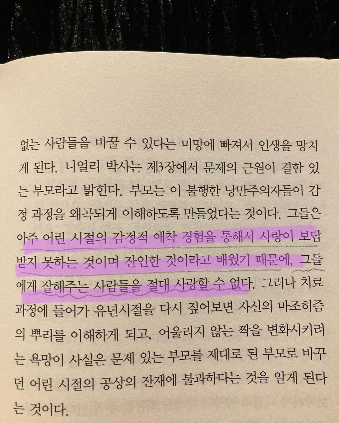 더불어 “아주 어린 시절의 감정적 애착 경험을 통해서 사랑이 보답 받지 못하는 것이며 잔인한 것이라고 배웠기 때문에, 그들에게 잘해주는 사람들을 절대 사랑할 수 없다”도 포함됐다.