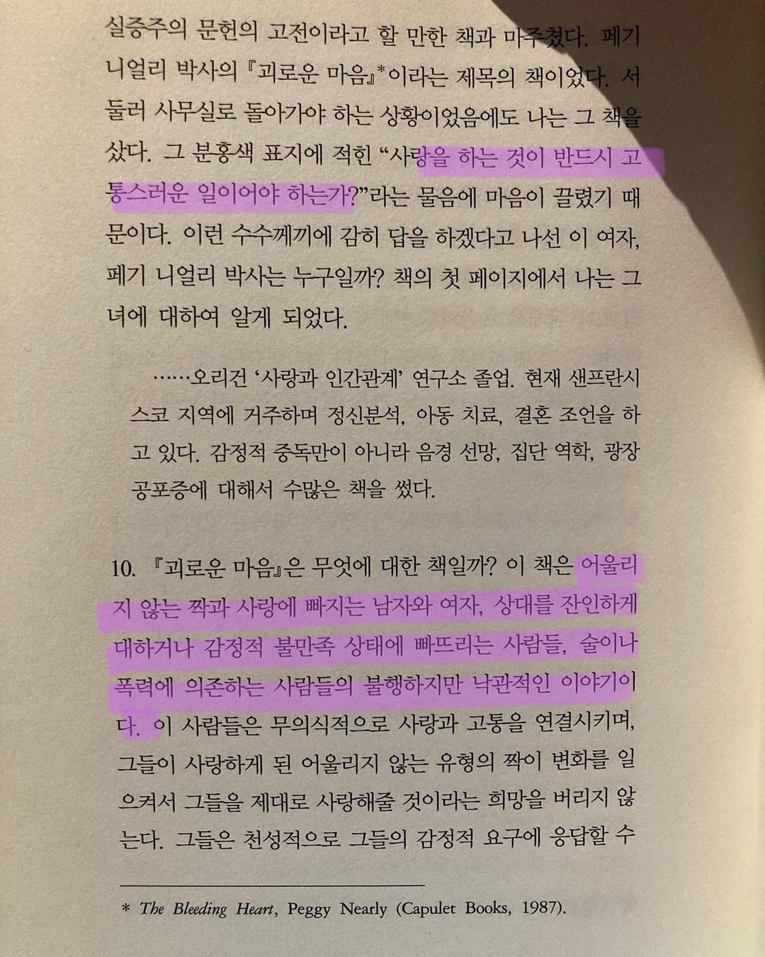 임보라가 형광팬을 칠한 부분은 “사랑을 하는 것이 반드시 고통스러운 일이어야 하는가?”라는 의문이었다.
