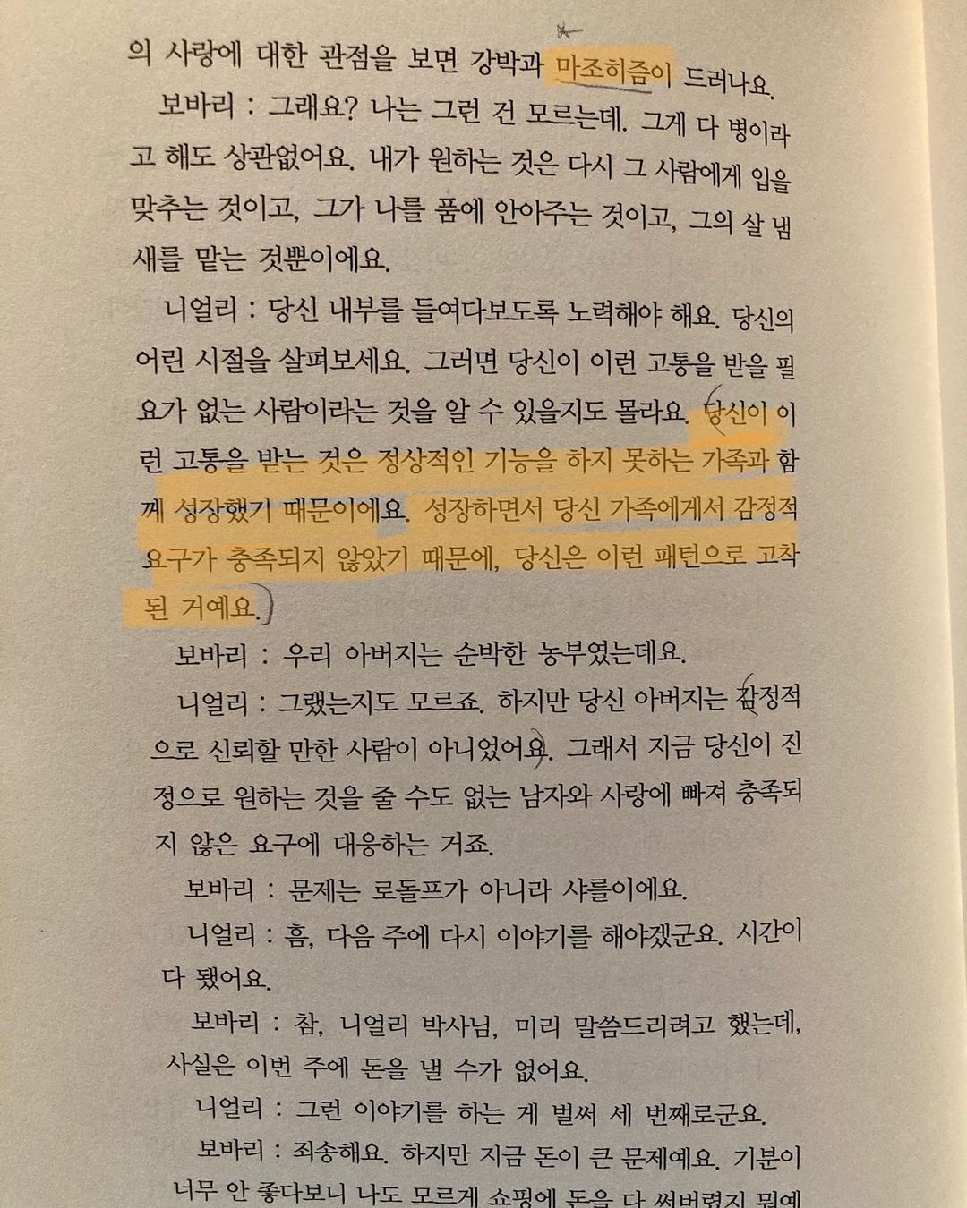 특히 임보라는 ‘마조히즘’을 강조하며 “당신이 이런 고통을 받는 것은 정상적인 기능을 하지 못하는 가족과 함께 성장했기 때문이에요. 성장하면서 당신 가족에게서 감정적 요구가 충족되지 않았기 때문에, 당신은 이런 패턴으로 고착된 거예요”에 밑줄을 그어 눈길을 끌었다.