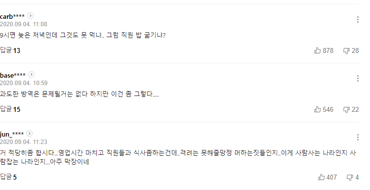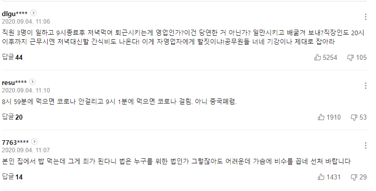 이에 업주들은 “직원끼리 식사를 하지 말라는 지침은 중앙대책안전본부나 각 구청에서 받은 적도 없다”며 정부 정책에 분노를 표했다.
