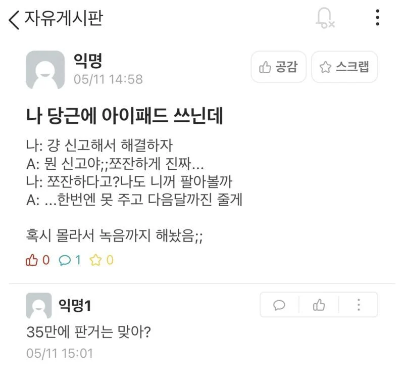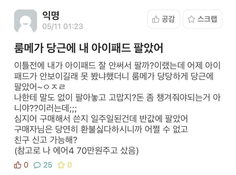 다음날 아이패드가 보이지 않아 룸메이트에게 물어보자 그는 “중고로 팔았다”고 말했다.