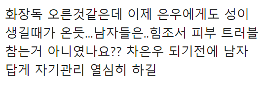 한 온라인 커뮤니티에는 “차은우 홈마가 이번에 화나서 풀어버린 피부 상태”라는 글이 올라와 누리꾼들 사이에서 화제가 되고 있다.
