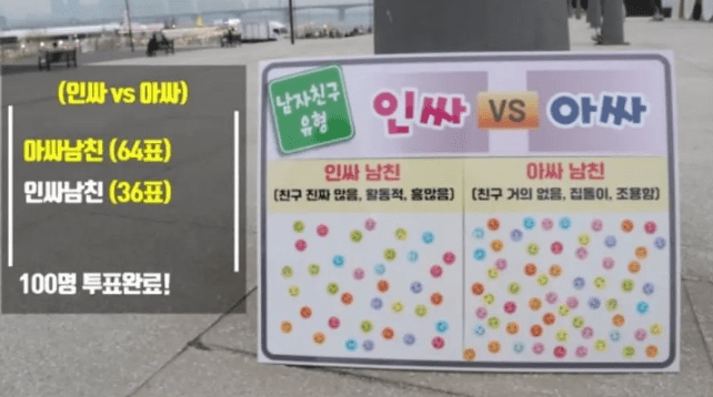 투표 결과 역시 ‘아싸’ 남자친구가 64표, ‘인싸’ 남자친구가 36표를 받으며 ‘아싸’ 남자친구가 압도적으로 이겼다.