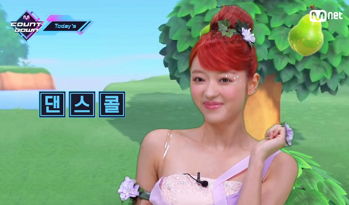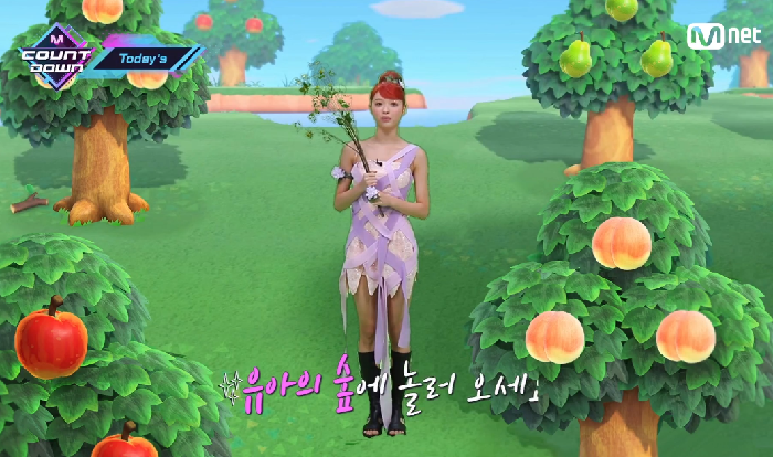 이날 유아는 노래의 분위기에 맞춰 숲에 사는 요정 컨셉으로 무대에 섰다. 그는 보라색 끈을 엮어 만든 베이비 핑크색 드레스과 검은색 신발을 매치했다. 여기에 나뭇잎 모양 헤어핀을 착용해 상큼한 분위기를 더했다.