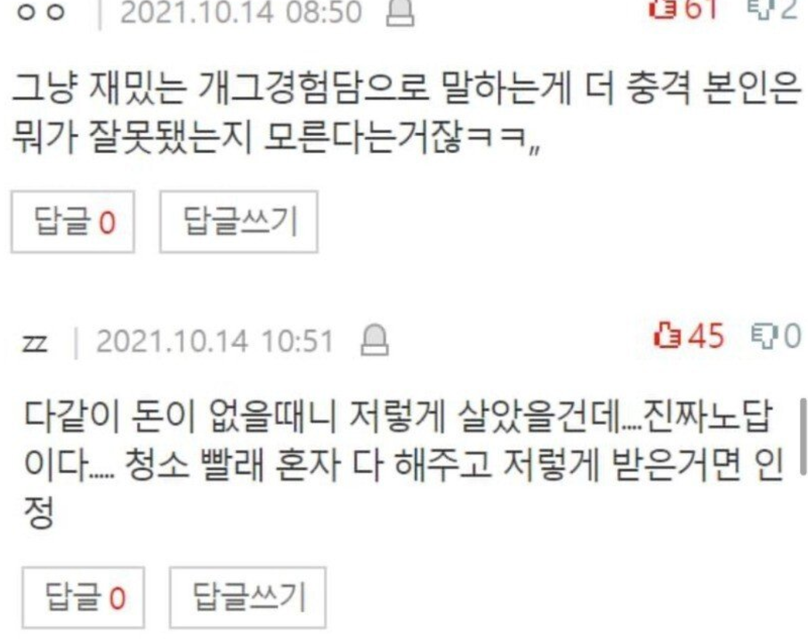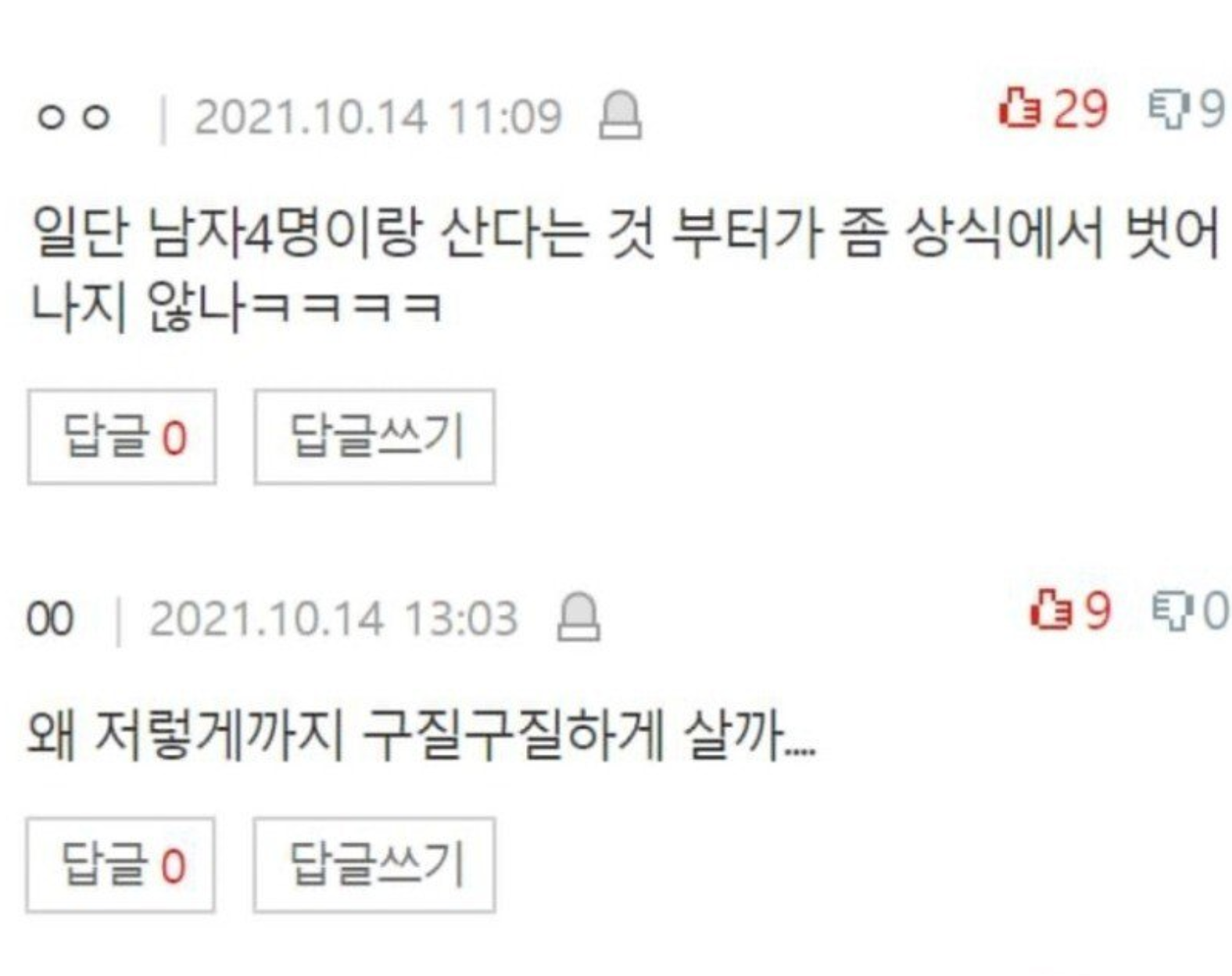 해당 게시물을 접한 누리꾼들은 “남자 넷이랑 같이 살았다구요..?”, “이거를 웃으면서 얘기한다고..? 같이 산 사람들은 뭐 어쩌라는거야..”, “와 이건 진짜 아닌데..?”,”이걸 웃어야하나..”라며 현재 다양한 반응을 보이고 있다.