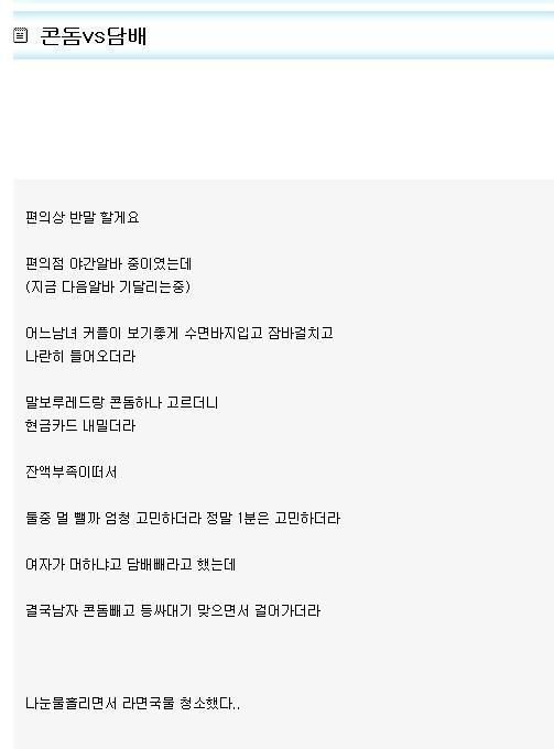 콘돔을 빼고 담배를 택한 남자는 여자에게 등싸대기를 맞으며 편의점을 떠났다.