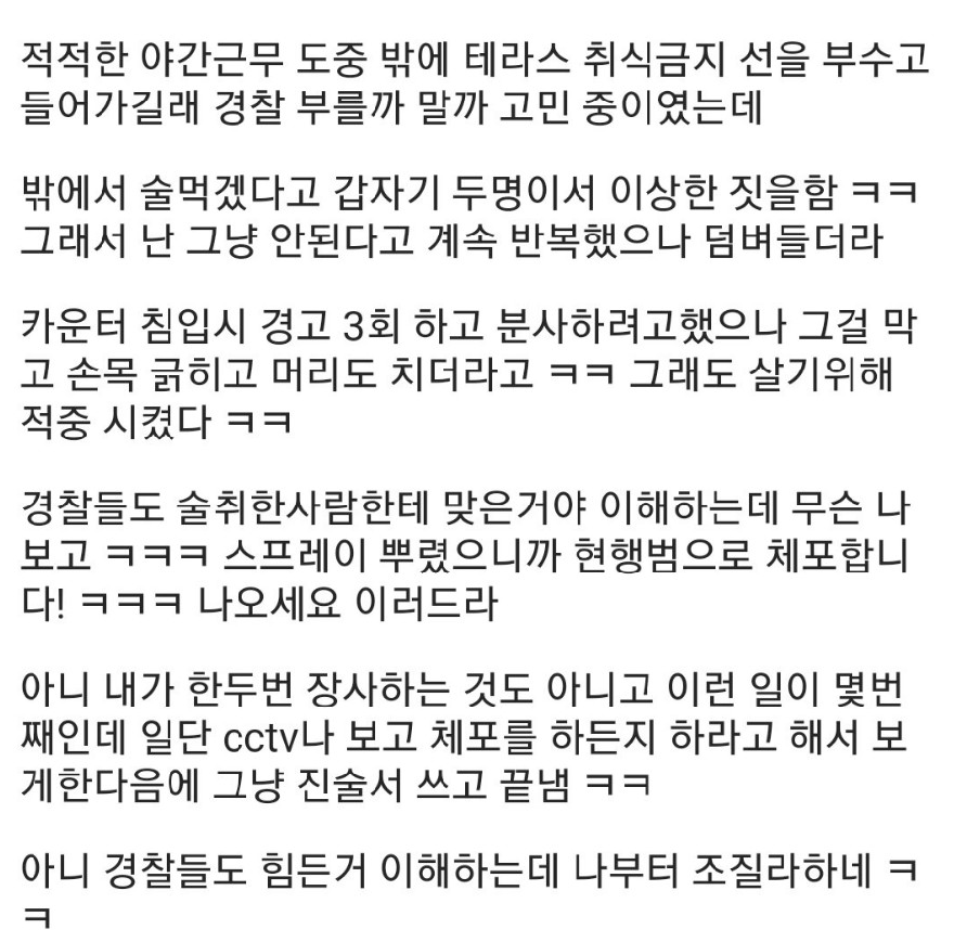 A씨는 “일단 경찰한테 CCTV를 보고 체포하든지 하라고 했다. 해당 장면을 보고 진술서 쓰고나서야 상황이 끝났다”고 전했다.