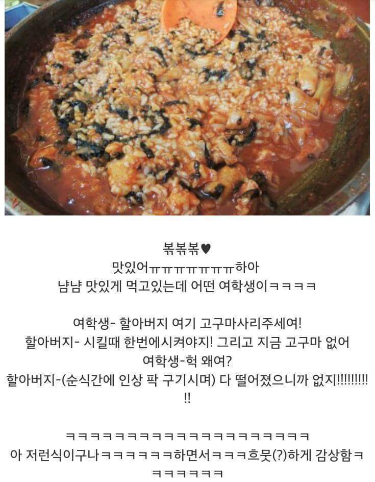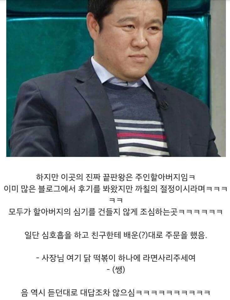 ‘쿨내’ 진동하는 떡볶이 맛집 주인장 할아버지 예전부터 “‘욕쟁이 할머니’가 있는 집은 맛집이다.” 라는 말이 돌곤 했었다. ADVERTISEMENT 욕을 먹더라도 계속 사람들이 찾을만큼 맛집이라는 것이다. 여기 ‘욕쟁이 할머니’를 잇는 ‘쿨내’진동하는 할아버지가 계신 분식집이 있다. 분식집을 다녀온 네티즌이 온라인 커뮤니티에 후기를 남겨 화제를 모았다. ADVERTISEMENT point 12 | 온라인커뮤니티 point 69 | 온라인커뮤니티 point 126 | ADVERTISEMENT point 0 | 온라인커뮤니티 point 57 | 온라인커뮤니티 point 114 | ADVERTISEMENT point 0 | 온라인커뮤니티 point 57 | 온라인커뮤니티 point 114 | ADVERTISEMENT point 0 | 온라인커뮤니티 point 57 | point 107 | ADVERTISEMENT point 0 | point 50 | point 100 | point 150 | ADVERTISEMENT point 0 | point 50 | point 100 | 1 ADVERTISEMENT