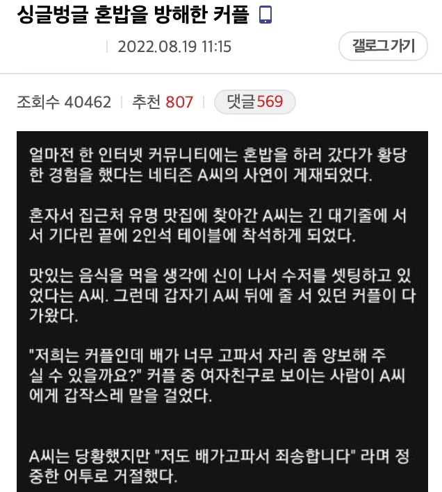 얼마전 한 인터넷 커뮤니티에는 혼밥을 하러 갔다가 황당한 경험을 했다는 네티즌 A씨의 사연이 게재되었다.