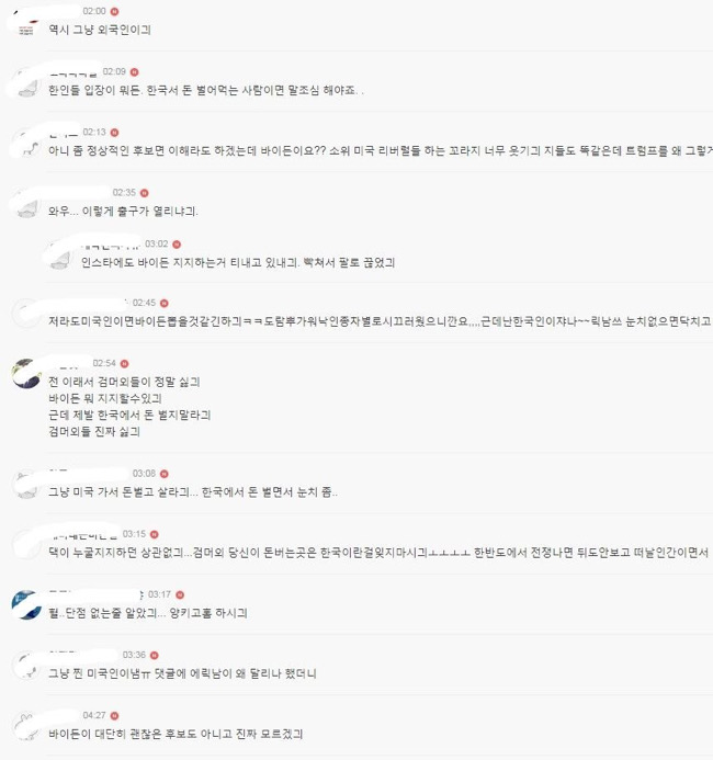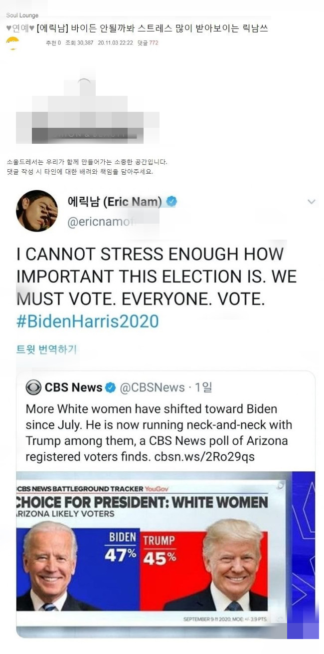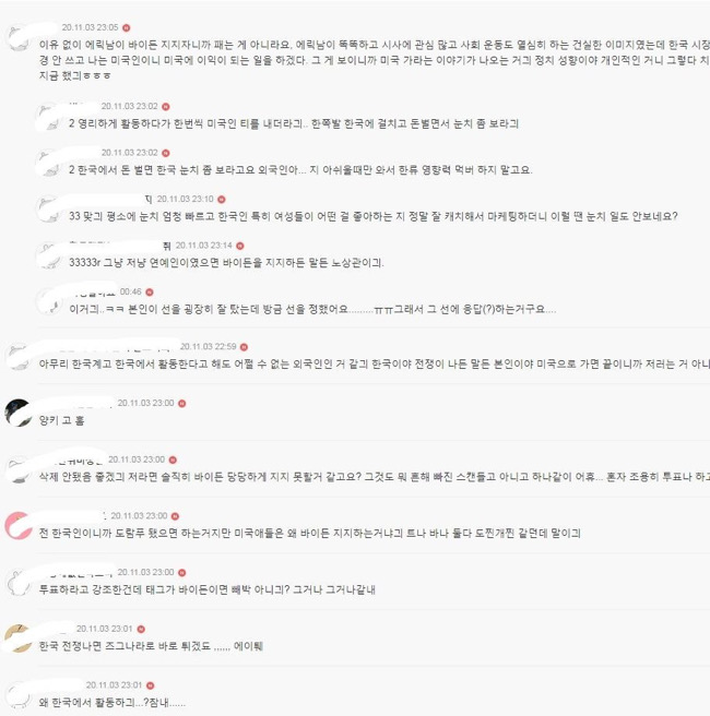 한 커뮤니티의 회원이 “에릭남- 바이든 안될까보 스트레스 많이 받아보이는 릭남쓰”라는 제목으로 글을 올리자 “에릭남이 바이든 때문에 갈줄이야”,”검머외 외국인 빠이”,”실망이다” 등의 댓글들과 “내가 미국인이라도 바이든 뽑을 거같다”,” 이해간다” 등 갑론을박을 벌이는 댓글들이 무려 700개가 넘게 달리고 있다.