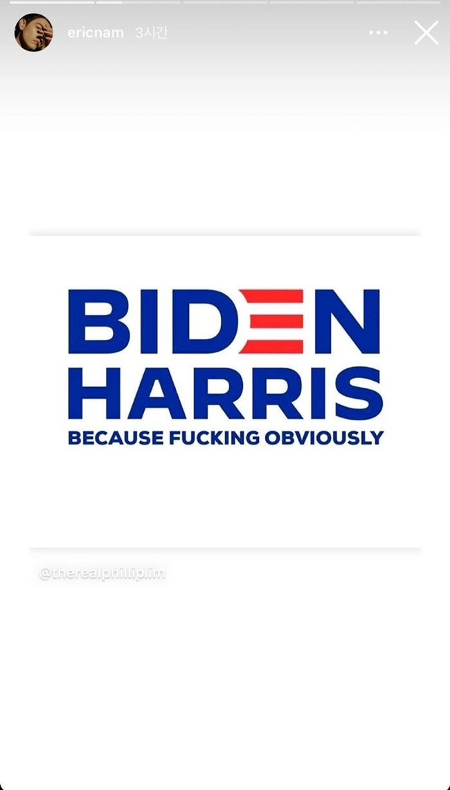 에릭남이 자신의 인스타그램에 바이든의 이름을 올리며 바이든 지지를 알리는 사진을 올렸다.
