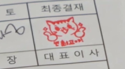 해당 사진에는 결재란에 대표이사의 도장이 찍혀 있는데, 고양이가 ‘넌 최고야’라고 말하고 있었다.