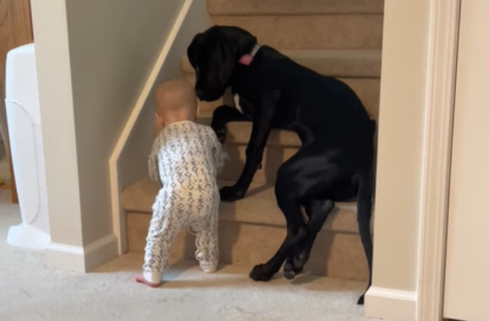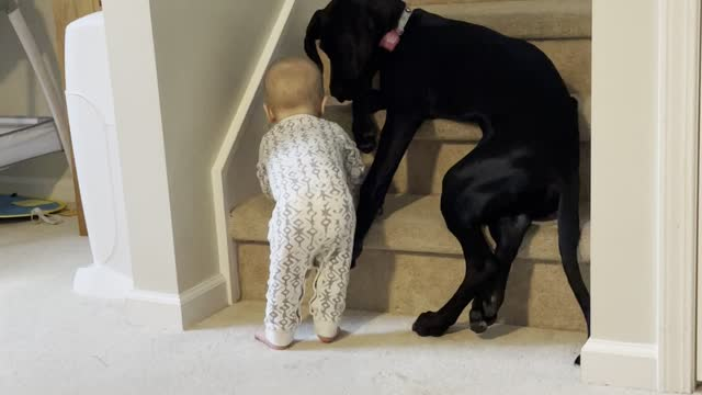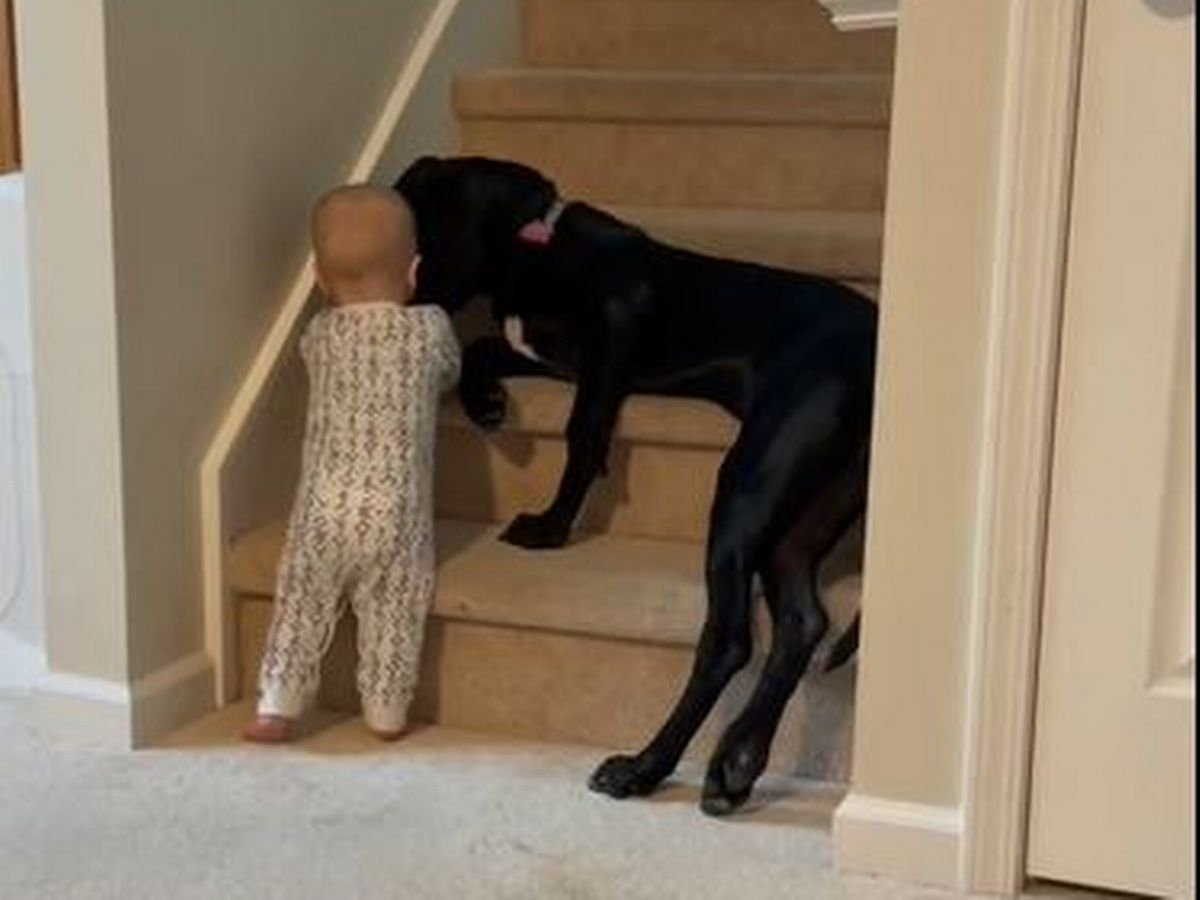 아기가 계단에서 등을 돌리자, 반려견 역시 할일이 끝났다는 듯이 내려온다.