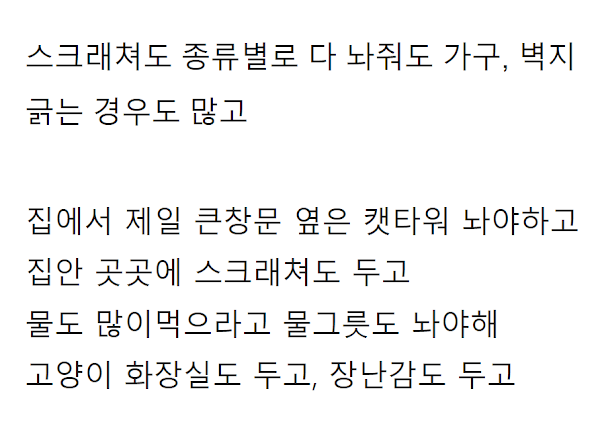 셋째, 고양이는 발톱을 스스로 다듬기 위해 스크레치라는 행동을 하는 동물이다.