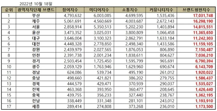 ’10월 대한민국 광역자치단체 브랜드평판’ 순위가 공개됐다.
