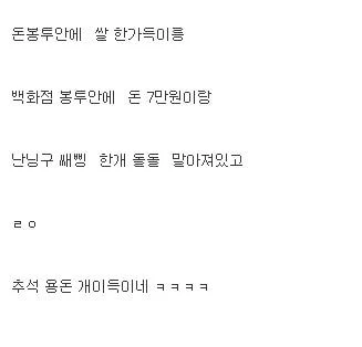 A씨는 “돈 봉투 안에 쌀 한 가득이랑 돈 7만원이랑 런닝셔츠 새거 한 개가 돌돌 말아져 있다”라며 “추석 용돈 개이득이다”라고 좋아했다.