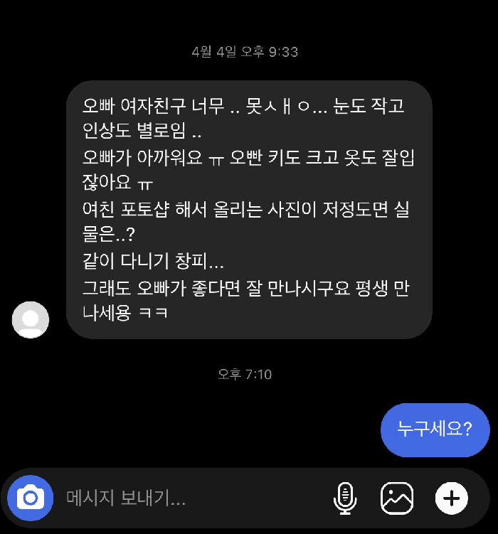 이어 “여친 포토샵해서 올리는 사진이 저 정도면 실물은… 같이 다니기 창피”라며 “그래도 오빠가 좋다면 잘 만나시구요 평생 만나세요”라며 조롱했다.