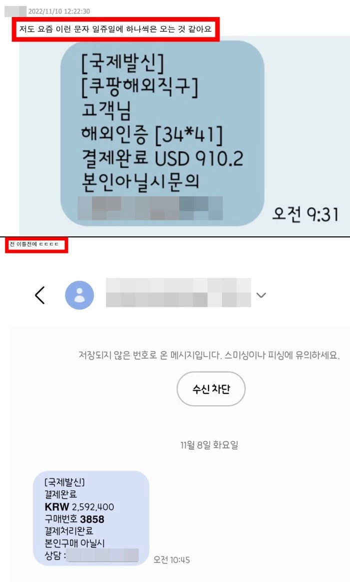 최근 오라인 커뮤니티에서는 ‘저도 85만 원 결제했다네요’ 제목의 글이 게재됐다. 이 글쓴이는 ‘오랜만에 받아봤다’라며 ‘[국제 발신] 해외직구 고객님 승인번호 850,000원 정상 처리 완료’라는 메시지를 받았다고 전했다고 한다.