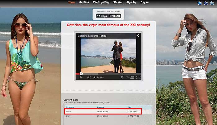 그녀는 인터넷 사이트를 통해 자신의 성적 순결을 경매에 부쳐서 판매한 결과 고액에 낙찰됐다고 했다.